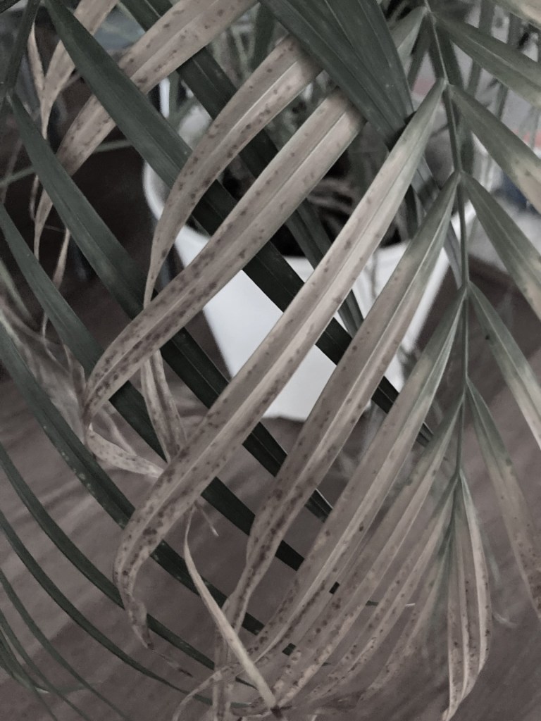 Jouw palmtakken in de palm van mijn hand. Mijn lieve Ikeapalm, het spijt me dat ik geen beter plantenmens ben, blijf alsjeblieft nog even in leven.